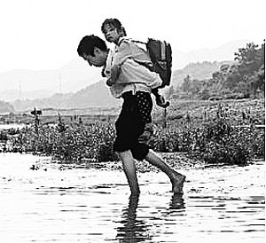 19年来,村里低年级的小学生正是靠这座“桥”,渡过宽100米的小河。因为村子地处偏僻,经济落后,修不起桥,瘦小的唐高群就背起孩子,送他们上下学,身体本来就不好的他几次差点栽倒在河里。