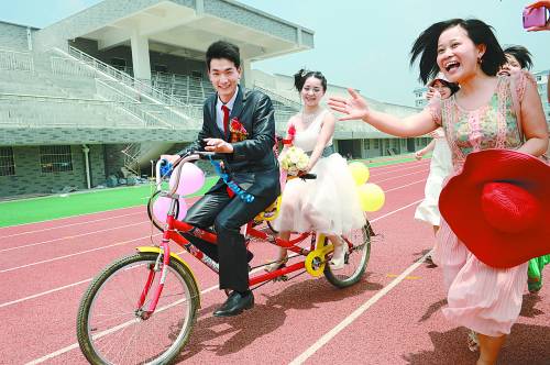 6月3日,湖南第一师范学院东方红校区的田径场上,一场校园婚礼正在进行。该校大四学生胡啸宇骑着自行车,迎娶了新娘刘庆华。