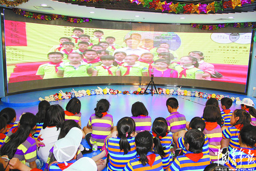 6月1日,四川雅安四小的校长谢建民通过视频连线,向远在北京参加未来网组织的“56个民族少年儿童心系雅安·相约中国梦”手拉手主题活动的少年儿童代表介绍学校灾后恢复上课情况。这些少年儿童代表5月31日还在北京奥体公园广场的百米长卷上写下了对雅安灾区小朋友们深深的祝福和自己心中的中国梦。