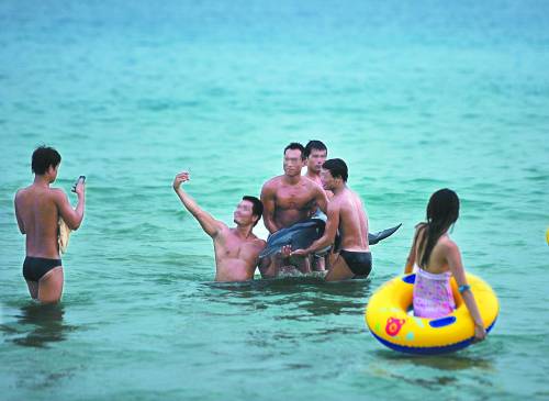 6月16日傍晚,在三亚大东海海域,一头搁浅的海豚被人发现。一些游泳的市民纷纷拿出手机,或拍摄已经奄奄一息的海豚,或是将自己和海豚一起合影,更有甚者,要求救生人员将海豚抬高一点,如此反复。晚11时半,这头海豚因呛水过多,肺功能衰竭死亡。