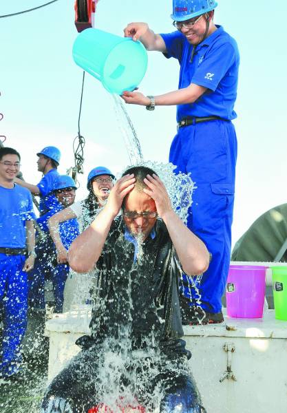 6月18日,安全返回的“蛟龙”号首位“乘客”、同济大学教授周怀阳接受特殊“欢迎礼”——浇水。