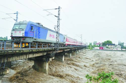 当日,受连日暴雨影响,四川成都青白江水位暴涨水势湍急,一艘铁驳船被洪水裹挟撞上宝成铁路青白江大桥,导致大桥受损。接到巡线人员报告后,成都铁路局迅速封锁线路,扣停线上列车。经初步检测,受损处暂时不危及行车安全,已于11时许限速45公里重新通行。目前,铁路工作人员定时巡查看守大桥,用精密仪器监测,待洪水消退后再行组织抢险。王正伟摄(新华社发)
