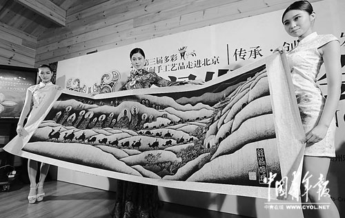7月9日,带着浓郁贵州山野风格的十件(套)民族民间手工艺精品出现在北京中央电视塔下,绿草环绕的小木屋中,这些朴实的作品弥漫着苗岭、侗乡、布依山寨的气息,贵州蜡染大师洪福远精心制作的“丝路明珠”在三位名模的演绎下,显示出时尚的魅力。