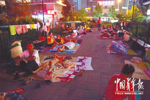 8月5日晚,北京儿童医院,许多来自外地的患者和家属在医院门诊楼前打地铺过夜。他们有的是为了方便第二天排队挂号,有的则是为了省下住宾馆的开支。