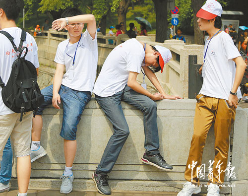 8月2日,清华大学校园内,几名从外地来到北京参加夏令营活动的学生累了,坐在栏杆上休息。