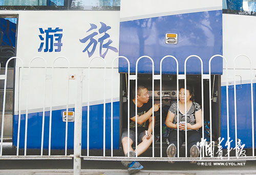 8月2日,北京市海淀区一景区门前,两名工作人员坐在汽车的行李仓里乘凉。