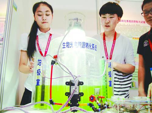 8月5日,由山东省寿光市第一中学学生发明的“生物光电能源转化系统在江苏南京国际博览中心举行的第28届全国青少年科技创新大赛上成为一大亮点。这套系统运用生物、物理、化学和计算机技术,可将泛滥成灾的浒苔作为原料进行发电。王启明摄