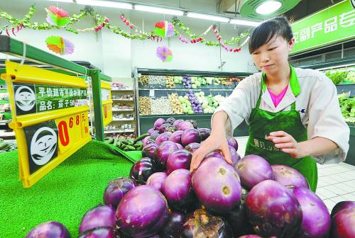 8月13日,在宁夏银川一家大型超市内,工作人员正在整理新鲜运到的蔬菜。