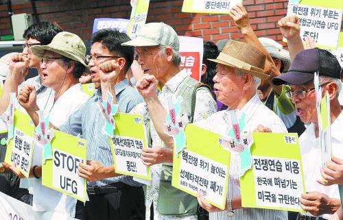 韩国反战人士19日在首尔一个美军军事基地外集会,抗议韩美联合军事演习。