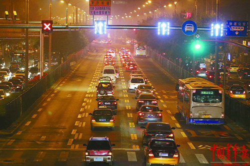 9月12日,北京市朝阳区朝阳路京广桥(东三环)至慈云寺桥(东四环)路段主路,三条出城车道车流如潮。当日,北京市在这一路段开通首条“潮汐车道”,每天晚高峰期间(17时至20时),交管部门把朝阳路试点路段进城方向主路的一条车道改供出城方向机动车使用。