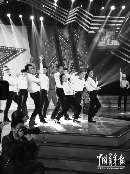 历时近3个月、3000名农民工参赛选手激烈角逐,湖北广播电视台垄上频道举办选拔全国“农民工星主播”9月30日晚9点迎来巅峰对决时刻。届时,全国九强将通过3轮环环相扣的残酷考验选出史上首位农民工主播。图为比赛开始之初,9位入围的农民工主持人以热情奔放的集体舞亮相。本报记者 谢湘摄