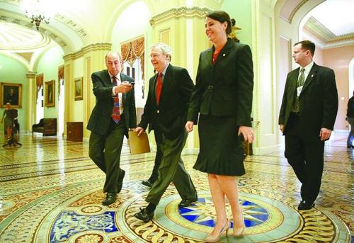 10月7日,在美国华盛顿,参议院少数党(共和党)领袖米奇·麦康奈尔(左二)走入国会大厦。