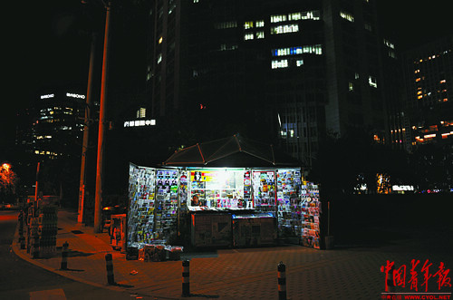 据报道,2013年北京各报刊亭营业额均再创新低。目前,北京市的报刊亭数量超过2000个,但多数要靠卖饮料、电话卡等维持。这些报刊亭散落在北京的大街小巷,也许终有一天这缕承载着太多记忆的城市微光将离我们远去