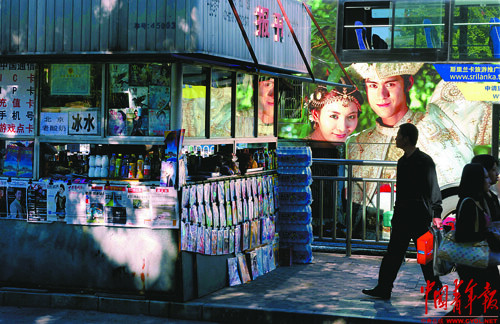 天安门广场西南角一家报刊亭前,聚集着大量游客,有抱孩子休息的,有问路的,有买饮料的,唯独却没有买报纸、杂志的,挂在报刊亭上的杂志封面已经被晒得褪了色。西长安街边中宣部门前的一处报刊亭,两位老人坐着聊天儿,巡警停下来和他们打着招呼。摊主刘女士说:“老邻居们会每天来报亭前坐坐,但买报的人并不多,长安街上走的多是游客,没空停下来看报,中宣部里面的报刊比自己这儿的还多还全。”