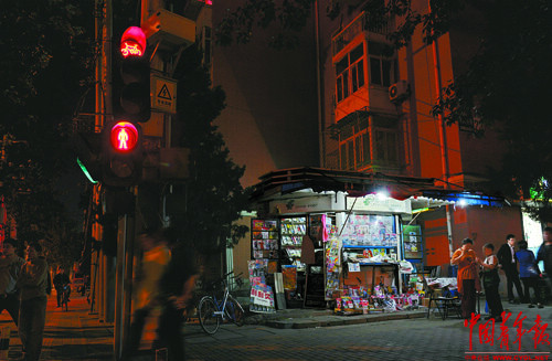 9月25日,北京东大桥路街角,附近的居民和隔壁房屋中介公司的职员,借着光线在报刊亭旁闲聊。这里虽然地处商业中心,人流量很大,但来买报纸、杂志的人却很少。