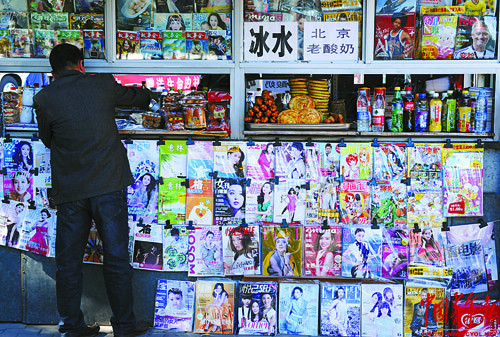 天安门附近一处报刊亭的柜台上摆着麻花、