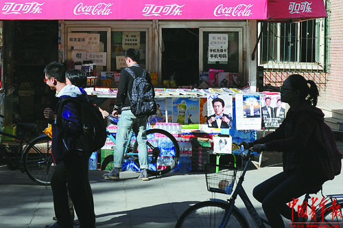 早晨,清华大学校园里,去上课的学生们路过报刊亭购买零食、饮料。平日,报摊上各式纪念品最受游客欢迎。