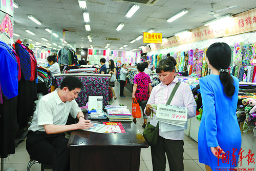 在东四商业街上摆摊卖报的周阿姨,抱着报纸,走到几百米外的一家布店,把报纸送到每个售货员手里,这个习惯她和儿子已经延续十几年了。