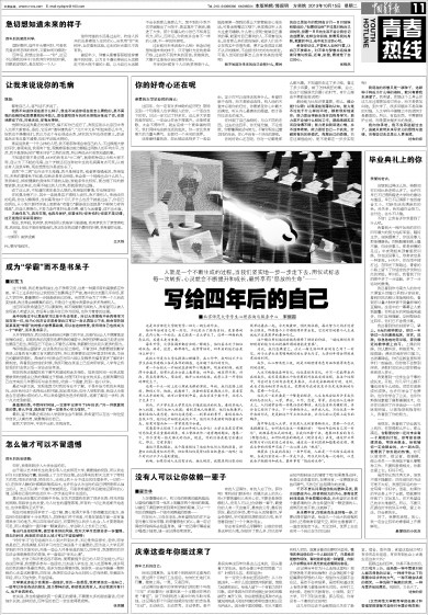 现在对班里的同学有了一些了解,真心觉得大学是个卧虎藏龙的地方,身边时时刻刻都有十分优秀的人,即使他们并不完美,可是在某些方面一定有值得我学习的地方。所以四年后的自己,你要明白以后步入社会,人才更是随处可觅,所以希望你一直怀着一颗谦逊的心,学会取人之长补己之短。