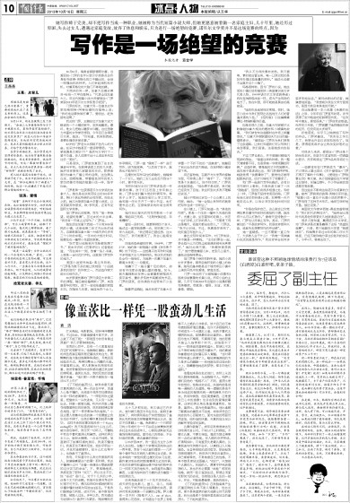 但门罗自己却觉得,写作“是一种绝望,绝望的竞赛”。在过去的大半生里,“我没有一天停止过写作。”门罗说。