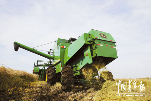 除了农场人高效的工作效率,大面积粮食的收割问题能在短短几天内就被解决,还要归功于共青农场对大型农机的使用。