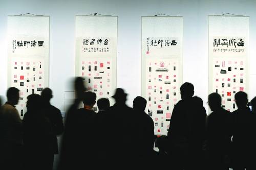 10月22日,杭州市,参观者在“印汇天下——国际印社联展”上欣赏西泠印社的参展作品。