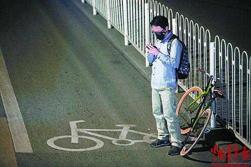 晚高峰,一名“死飞党”在自行车道上查看手机。