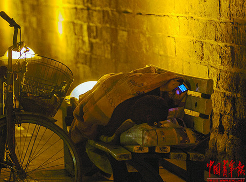 10月17日晚,北京东长安街城墙角下,一名中年人蜷在长椅上看手机。