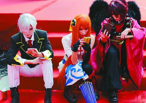 10月19日,北京国际动漫博览会上,参加COSPLAY表演的中外演员在台口“刷屏”等候上场。