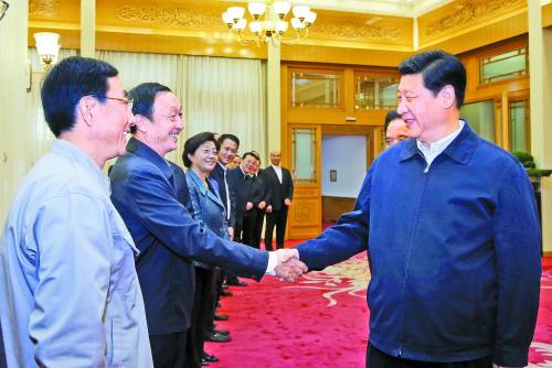 10月23日,党和国家领导人习近平、刘云山等在中南海同中华全国总工会新一届领导班子成员集体谈话。这是习近平在会前同班子成员亲切交谈。