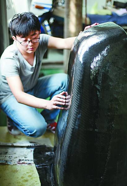 在制作车壳方面队员们又面临着新的问题。“车队的经费不多,如果买一些像碳纤维一类的材料,成本太高。再三权衡下,最终选择了成本较低的铝皮,我们觉得用钱不多却能做出同样效果的东西,也算节能的一种体现吧。”蓝保桢笑着说,“之所以用铝皮作车壳,还因为铝的密度小,质量轻,这样可以大大减轻车壳的重量,减小车的行驶阻力,从而最大程度上减少油耗,实现节能。相同的道理,发动机和车架也尽量做到最轻。”