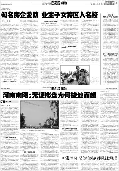 一年多以来,河南省南阳市博雅书院学校校长王学平(又叫王平——记者注)一直提心吊胆。学校门口约15米宽的马路南侧,来了一位“新邻居”——四季花城房地产项目二期。该楼盘要在学校正前方的空地上建成5幢高层,前排两幢23层,后排三幢27层。