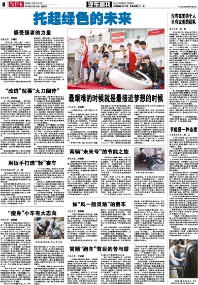 本次节能车大赛,学校派出燃油组和电动组各一支车队集体亮相广州。杨雨弋说:“燃油组车队名为‘风行者’,我们希望它有风一样的速度,风一样的灵动,风一样的快活;电动组车队叫做‘极风’,风是电动车最大的法宝,利用好风能便可以助我们一臂之力。”
