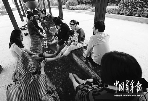 农户家的温泉池修建得颇具乡野风情,墙上有小桥流水人家、荷塘月色等各式彩绘,池底铺满鹅卵石,方便游人按摩脚底,池边贴心地围上一圈木板,可以舒服地坐在木板上泡脚。本报记者 李建泉摄