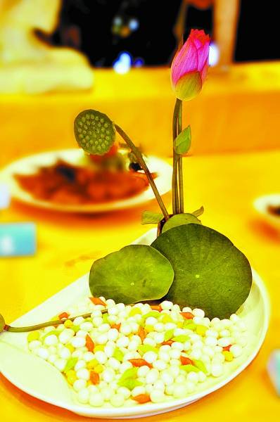 一支赶在当天晨光照耀前划船采撷的荷花,水灵灵地玉立在雪似的白果、鱼丸之上,吸引了所有人的目光。