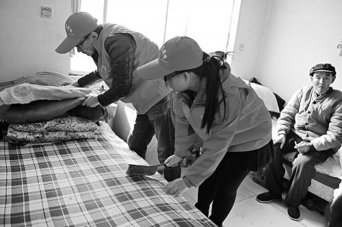 11月13日,国家电网山东青州市供电公司志愿者来到弥河镇敬老院,为全院45名老人送生活用品,还为老人表演节目并陪老人们聊天,让他们感受到社会的温暖。图为志愿者为老人们整理床铺。王继林摄(新华社发)