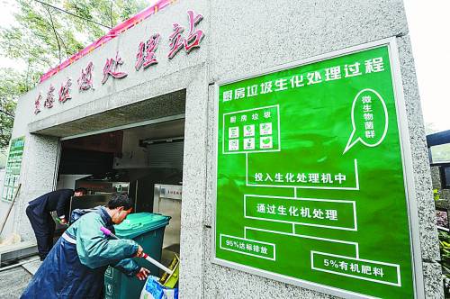 11月14日,工作人员收集经过降解处理后的生态肥料。从11月初开始,杭州市西湖区西溪街道溪畔社区正式启用社区生态垃圾处理系统。社区对各家各户普及垃圾分类知识并免费发放实名对号垃圾袋,然后将居民产生的厨房垃圾进行分拣,利用生态垃圾处理设备进行降解处理。通过微生物发酵分解,大部分转化为无害气体和水,剩下的变成生态肥料,免费提供给种植花木的小区业主。新华社记者 徐昱摄