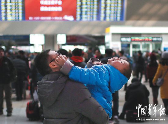 1月26日,在北京南站拥挤的候车大厅里,即将踏上G59次列车返乡的父子嬉戏着,脸上透着回家的喜悦。据统计,1月25日全国铁路发送旅客约680万人次,26日的客流与25日大致相当,春运进入高峰时段。