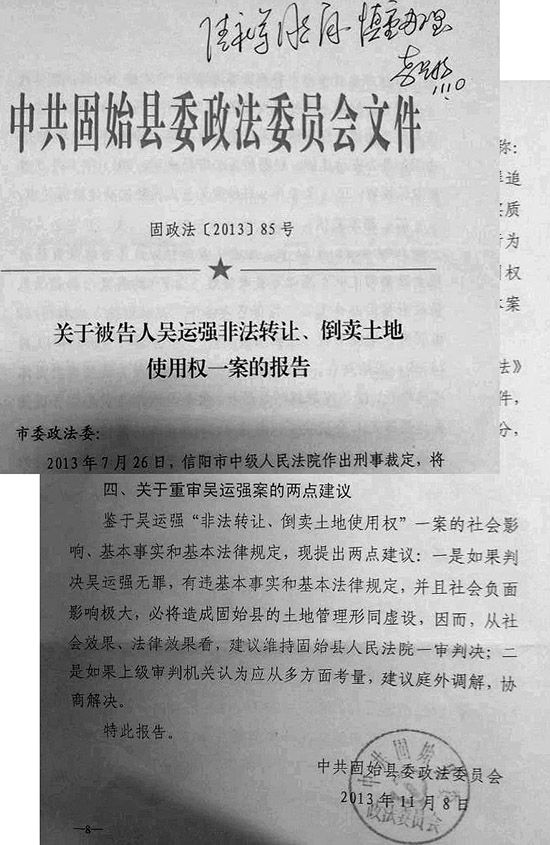 在这份名为《关于被告人吴运强非法转让、倒卖土地使用权一案的报告》中,固始县政法委在没有提供新证据的前提下,以相同的材料,给出了与信阳市中级人民法院裁定大相径庭的法律意见。