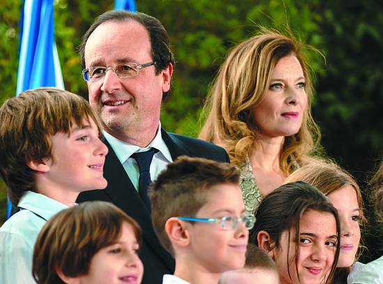 法国总统弗朗索瓦·奥朗德1月25日通过法新社宣布已经与瓦莱丽·特里耶韦莱分手。年近50岁的特里耶韦莱曾是法国著名的政治记者,她从2006年开始与奥朗德共同生活,但两人一直没有结婚。这是奥朗德(中后)和特里耶韦莱在耶路撒冷与迎宾儿童合影的资料照片(2013年11月17日摄)。
