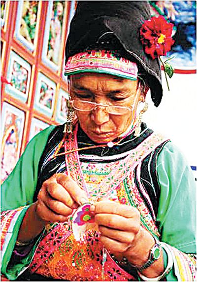 在一家琳琅满目的云南少数民族绣品店内,时髦的姑娘们叽叽喳喳,挑选着来自深山巧妇之手的饰品、箱包。一个女孩刚买了一个带有彝绣图案的手包,就迫不及待地把胳膊上挽着的名牌包换下来,对着镜子自我欣赏。
