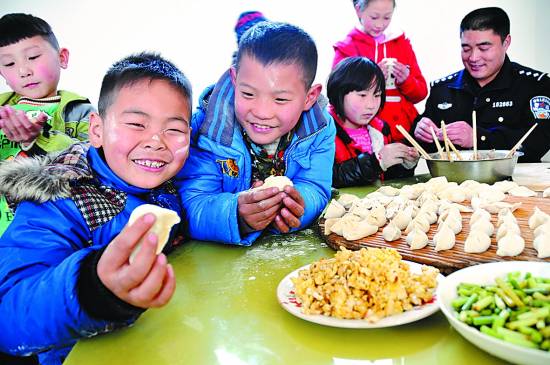 1月28日,山东省临沂市郯城县公安局港上派出所民警与留守儿童一起包饺子、贴春联、做游戏,赠送新年礼物,让他们提前过一个快乐的“团圆年”。