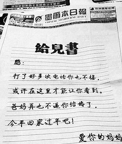 可直到现在,也没人找到“鹏”。编辑也不愿透露,这封家书是策划,还是确有那位忧心忡忡盼子归家的母亲。