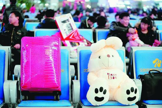 1月22日,辽宁省沈阳市,候车大厅里,行囊旁的玩偶是送给家人的新年礼物。