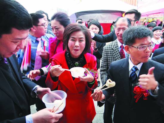 2月13日,高雄,在第三届北京特色周开幕式上,台湾行政部门“政务委员”杨秋兴品尝了北京庆丰包子,并竖起拇指连连称赞。