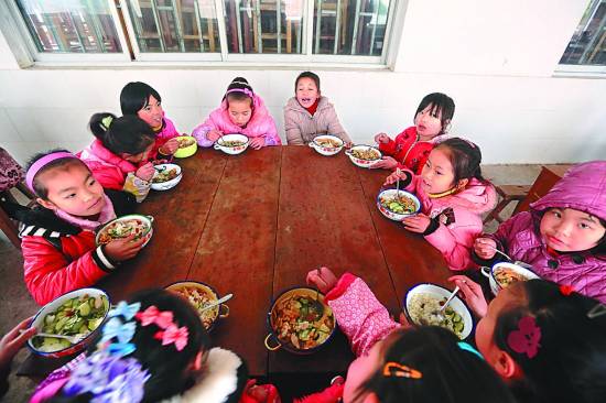 2月17日,在广西柳州市融安县大坡乡中心小学饭堂,学生们在吃免费营养午餐。当日是今年春季学期的第一天,从新学期开始,柳州市开设免费午餐学校已经达到1061所,柳州每年投入8672.37万元用于农村义务教育学校免费午餐开餐经费,另外,市县财政专门拨付1723.6万元用于厨房工人工资和燃料费补贴,总投入超过1亿元以上,共惠及17.98万农村中小学生。