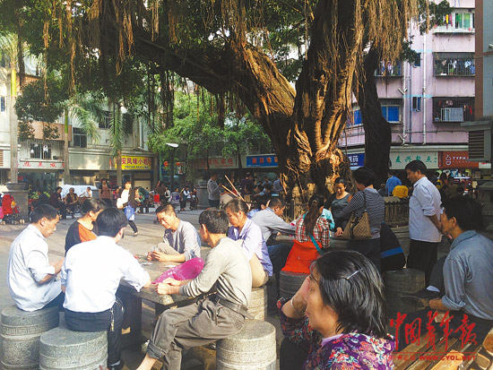 穿过几条狭窄的小巷,他出现在石厦村的大榕树下。这是村里唯一一个开阔的地方。大榕树枝叶蔓延,像一个华盖。树下有几张石桌,周围有一圈栏杆和石凳。旁边的道路也比较宽敞,多年来一直是司机交接班的地方。