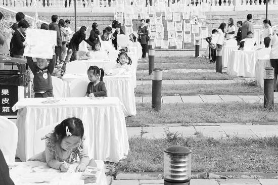 本报讯(实习生余程)4月26日,在北京朝阳公园,最大手指印绘画成功冲击吉尼斯世界纪录。经过吉尼斯认证后,这幅画作被粘贴于“低碳·健康家生活”家庭环保秀活动现场的巨大环保袋上。
