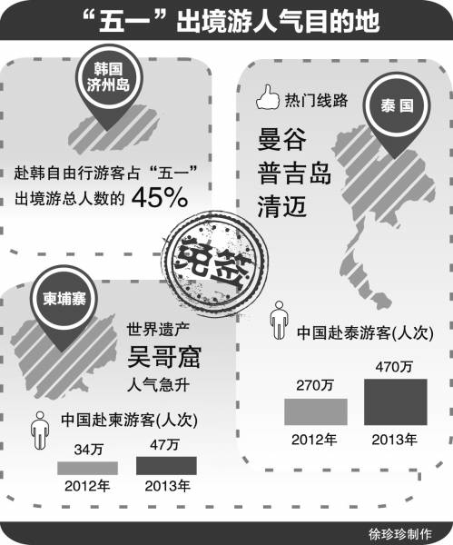 携程统计显示,2014年“五一”小长假期间,通过携程网销售各类旅游产品的旅游者增长超过一倍,旅游者到达500多个境内外目的地城市,我国旅游消费市场呈现旺盛需求。“五一”小长假出境旅游,按照我国游客到达国家和地区的人数排行,前10名依次为:香港、韩国、泰国、日本、台湾、马尔代夫、印度尼西亚、柬埔寨、澳门和美国。2013年在携程“五一”出境目的地人气排行中位列第八的马来西亚,今年跌出前十。