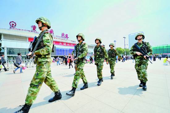 5月7日,武警重庆总队七支队的官兵在重庆龙头寺火车站广场巡逻。从今年3月开始,武警重庆总队官兵在重庆市的各大车站、码头、商圈和机场以及市区主干道等地加强巡逻,维护社会稳定,保障群众安全。张春华摄(新华社发)